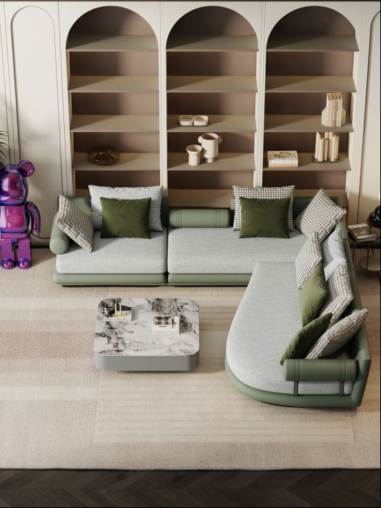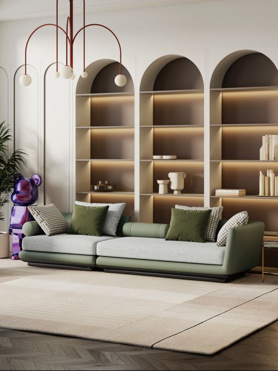 淺綠色系是意式裝飾中的傳統色系。洛品這套布藝沙發從自然環境中汲取靈感,通過借鑒戶外的調色板為溫馨宜人的空間做點綴,意式極簡大理石茶幾充當“客廳顏值擔當”,讓客廳散發出優雅的氣息。柔和的垂柳綠色、沙色和銀灰色的大地色調將外部景觀引入室內,讓春日色彩在室內綻放光芒。
