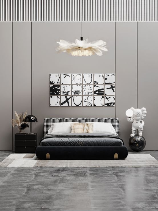 一張洛品有家卡薩系列軟體床,搭配色調(diào)一致的床頭柜,勾勒臥室的藝術(shù)感。充滿意式簡奢風格的黑色線條釋放出無拘無束、放松舒適的態(tài)度,讓原本的空間不再單調(diào)。