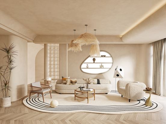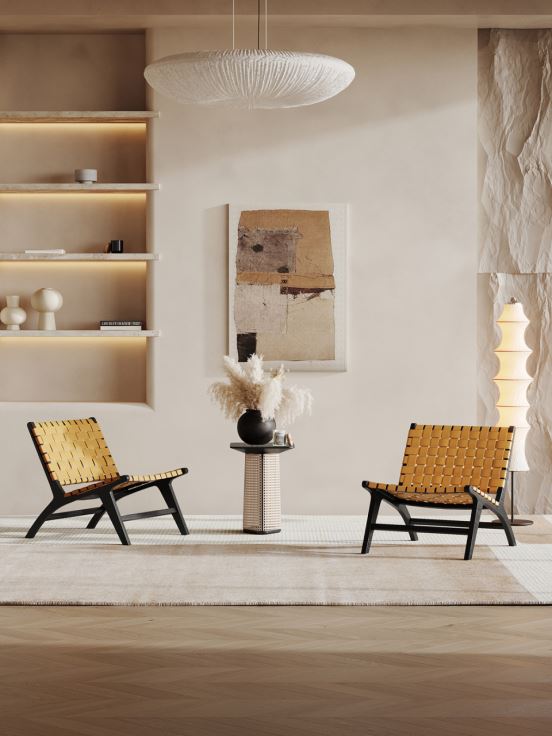 客廳,作為家居環境中出鏡率最高的地方,營造清爽宜人的客廳空間尤為重要。在客廳布置的時候,選用洛品有家侘寂系列家具。比如藤質休閑椅,置于屋內一角,搭配綠植裝飾,清新自然中又透出古樸沉穩的意境,對避暑相當有益,是休息及會客的特色空間。