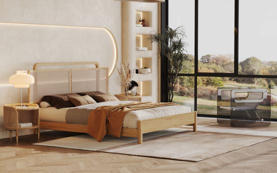 藤木工藝結合的極簡大床滿載著溫柔與舒適,將時尚與古典兼容,散發著純天然植物特有的光澤,為家居生活平添了幾分淡泊和從容。