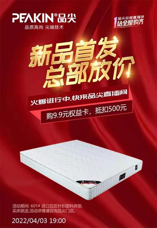 在直播當天,品尖將推出專業設計師推薦的超級套餐驚爆價,“床+墊”的組合套餐,幫你解決選擇的困難。每個套餐組合都由專業設計師設定,最時尚的套餐組合可以完美搭配各種裝修風格;更是用總部最大力度的補貼,讓消費者輕松享受好睡眠。