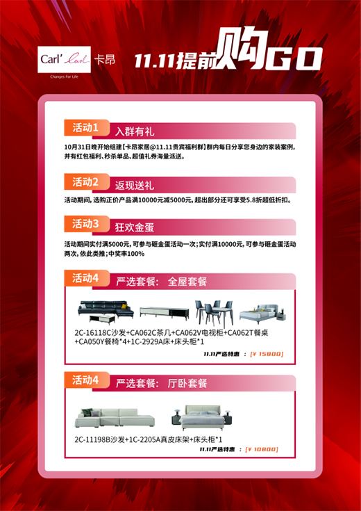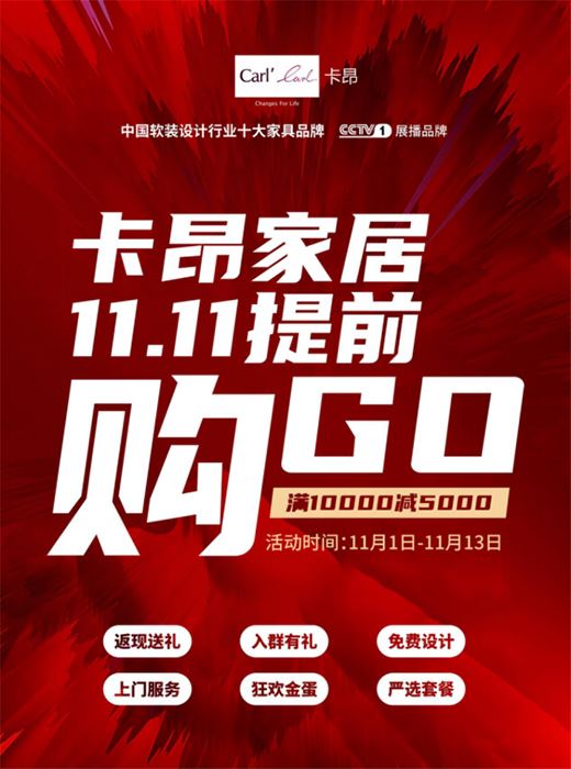 10月31日晚8點,隨著京東、天貓開啟尾款支付,雙十一購物狂歡節正式打響!為回饋廣大忠實客戶,卡昂家居于11月1日-11月13日重磅開啟“11.11提前購go,滿10000減5000”的大促狂歡活動,豐富的優惠政策、高顏高質的產品矩陣、海量家居福利,為消費者打造一場別具一格的家居鉅惠盛典!