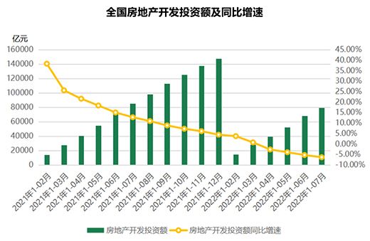 2022年以來,房地產(chǎn)市場呈下行態(tài)勢。從1-7月的房地產(chǎn)開發(fā)運行數(shù)據(jù)看,各項指標(biāo)跌幅再次擴(kuò)大。其中,1-7月,全國房地產(chǎn)開發(fā)投資額為7.95萬億元,同比降幅繼續(xù)擴(kuò)大至6.4%,為歷史降幅最大值;1-7 月,全國商品房銷售面積78178萬平米,同比下滑23.09%,住宅銷售金額為66328億元,同比降幅31%。