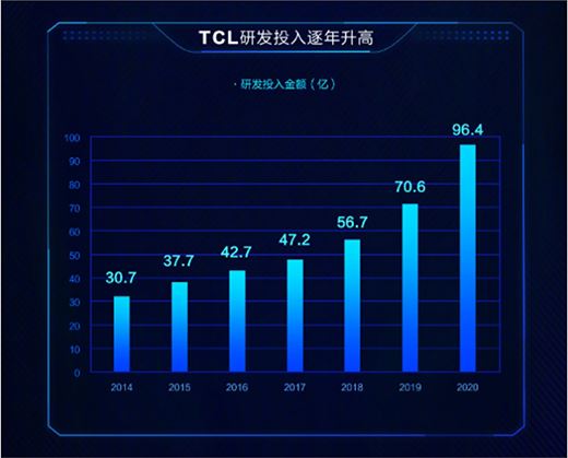 領跑全球并不容易,要超越,就要比日韓企業投入的更多,布局的更早。為此TCL早在2018年就開始了布局,接著加大了技術研發投入,2020年,TCL全球研發投入超96.4億元,同比增長36.5%。2021年上半年在研發方面投入的資金有50.9億元,同比提升76.9%,增速相當驚人。海量研發轉化為巨大的技術儲備,截至2021上半年,TCL專利申請總量77167件,位居中國家電企業第一。
