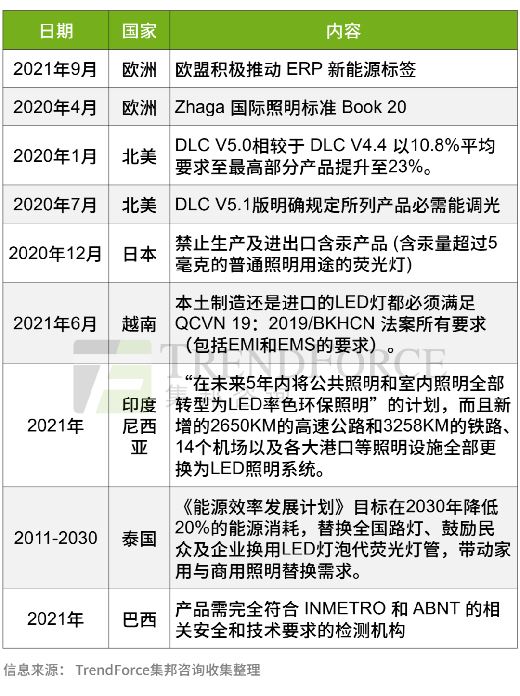 自疫情爆發(fā)后,各國家積極推動綠色照明計劃,大部分國家都制定了硬性的法律法規(guī)以及目標(biāo)完成標(biāo)準(zhǔn)。其中典型的是歐洲、中國及其他部分國家實施的能源標(biāo)簽降級以及產(chǎn)品信息透明化。能源標(biāo)簽降級避免了因技術(shù)發(fā)展而導(dǎo)致的以往“AA”、“AAA”、“5A”等的混亂標(biāo)注的標(biāo)簽出現(xiàn)。同樣的QR code 更方便使用者與其他關(guān)聯(lián)行業(yè)對產(chǎn)品信息的充分了解,從而使產(chǎn)品信息化讓消費者的自主選擇性更強。其次對有毒有害污染嚴(yán)重的產(chǎn)品及材料的全面禁止,如日本禁止進(jìn)出口含汞產(chǎn)品。