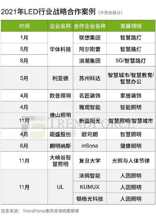 2021年照明企業(yè)紛紛與互聯(lián)網(wǎng)公司、智慧照明云平臺企業(yè)以及其他科技企業(yè)合作,分別在智慧照明下的細(xì)分場景展開合作,如利亞德、佛山照明在智慧城市、智慧教育及智慧辦公領(lǐng)域的布局,以及華體科技聚焦智慧路燈上,而UL的發(fā)展方向之一為人因照明等。