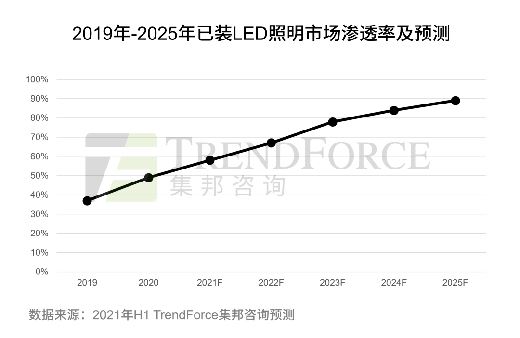 上游的產(chǎn)量暴漲,代表著下游的需求暴增。從燈具產(chǎn)品來看,2021年前三季度,中國照明產(chǎn)品出口總額為469.99億美元,同比增長達(dá)32.68%(中國照明電器協(xié)會),其中LED燈泡出口數(shù)量最多,達(dá)到45.49億件,出口金額也達(dá)到了33.86億美元。從市場滲透率來看,LED照明從2021年滲透率就接近60%,未來LED照明滲透率將持續(xù)增長。