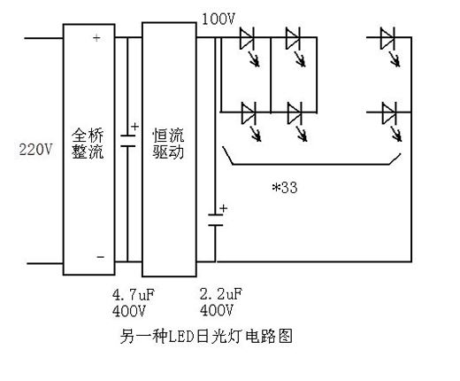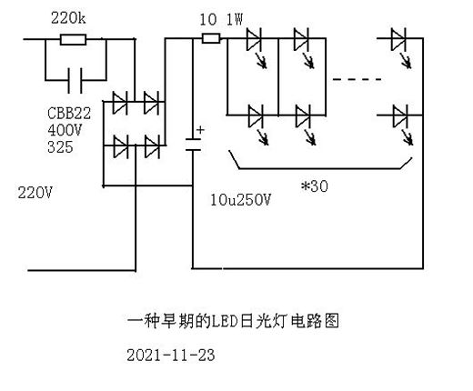 第一種是一種早期的LED燈電路,采用電容降壓,橋式整流,電容濾波,電阻限流給LED燈珠供電,LED燈珠采用兩個一組并聯,再30個串聯的方式。