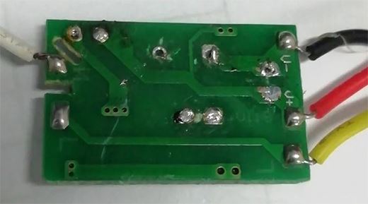第三種是比較新的,電路比較復雜,電路中用到一個全橋整流,一個芯片控制的恒流驅動電路,還有電容濾波,發光二極管是采用兩個一組并聯,再33個串聯的方式,。電路采用表面安裝元件,雙面印刷電路,下面一張照片是我把電感線圈拆掉后看到的線路樣子,太不好看懂了,我也沒有畫出來。