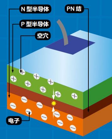 它的內部半導體晶片結構由兩部分組成——N型半導體和P型半導體。N型半導體中主要含有電子,而P型半導體中空穴占主導地位。當這兩部分半導體連接在一起的時候,它們就形成了“PN結”。電流通過這個PN結時,電子和空穴相結合,產生自發輻射光。