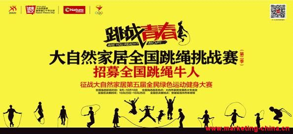 即日起至10月5日,全國各地熱愛跳繩、熱愛運動的親們,只要你身體健康,即可到大自然地板、木門和櫥衣柜等在全國各地的專賣店報名參賽,只要你敢來,大自然陪你玩!了解詳情,可掃描以下二維碼 。