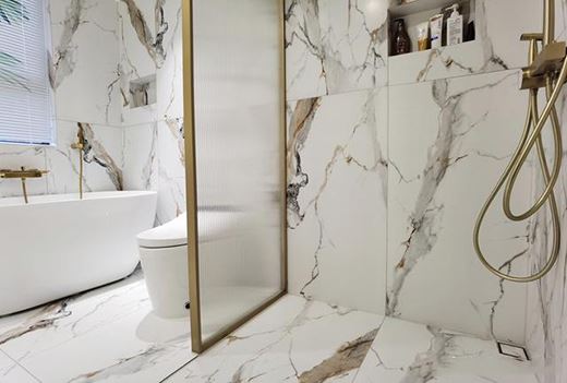 第二種則是切割一塊1-2cm寬的瓷磚,切海棠角碰角拼接,用美縫劑勾縫之后好看又好用,這種方式稍微復雜一些,一定要跟工人師傅確認好,千萬不要做45°那種斜切,不然瓷磚邊角位置就很脆,稍微一碰就會缺角。