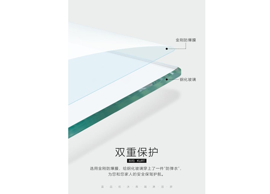 安全是淋浴房產(chǎn)品之重心,為避免淋浴房安全事故的發(fā)生,藍(lán)品優(yōu)沐科特·KURT淋浴房擁有金剛防爆膜與鋼化玻璃的雙重安全加持,為安全沐浴鎖上雙重保險!