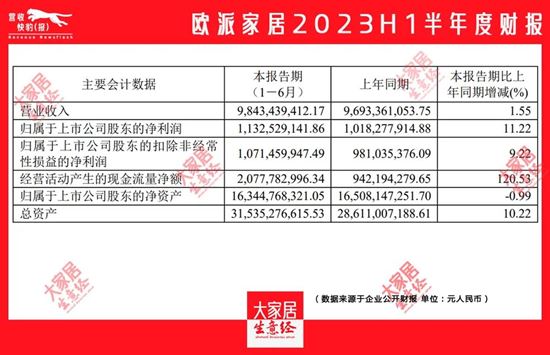 1歐派家居2023上半年營收98.43億元,同比增長1.55%