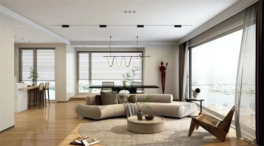 純白基調的居住空間,暖白色的線條和灰白色的布藝沙發與整體風格相呼應,在這里,你的想法可以無限暢游其中。【WK001-白混油】室內門前衛時尚,搭配一盞氛圍感落日燈,讓居住者在日常中感受生活的多姿多彩。臥室舒適而精致,方形落地窗將窗外的光影引入室內,帶來明亮通透光感,加上半透明的白色窗紗,打破單調,透露出空間的靈活生動。