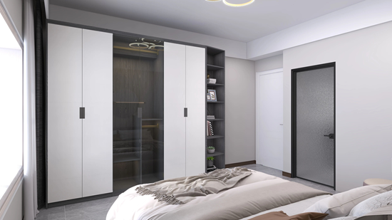 細(xì)節(jié)亮點(diǎn):“封閉+開放 +玻璃”的模塊化組合 ,既通過封閉式柜門滿足衣物收納的私密性與整潔感,又以開放式格架和玻璃門區(qū)域,為書籍、擺件提供展示空間,實(shí)現(xiàn)收納與展示功能的平衡。細(xì)節(jié)處,黑色金屬拉手與邊框的呼應(yīng),強(qiáng)化了線條的利落感;玻璃門的通透屬性,讓內(nèi)部收納布局清晰可見,同時(shí)為空間引入更多光影層次。