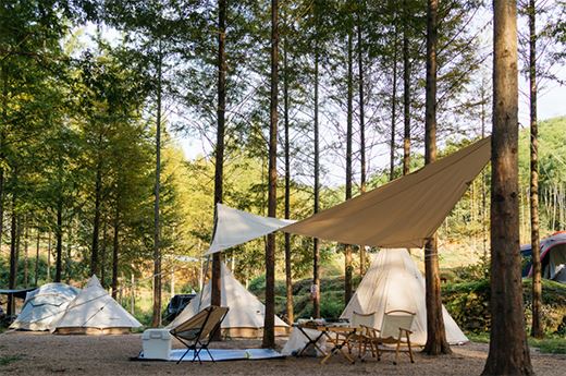 白色的帆布帳篷搭配星星掛燈,當夜幕降臨,燃起火堆,和朋友促膝交談,郊區、山野的上空繁星滿天,躺在簡易的床上,呼吸著和城市不同味道的空氣,安靜地睡去。
