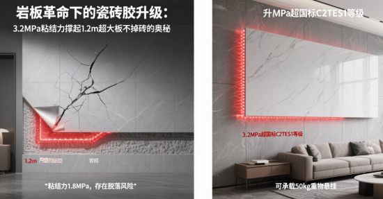 在當今建筑裝飾領域,巖板的出現宛如一場革命,徹底改變了傳統瓷磚的應用格局。巖板以其大尺寸、高性能等特點,迅速成為眾多設計師和消費者的心頭好。然而,巖板的大面積應用也給中國瓷磚膠品牌帶來了前所未有的挑戰,如何確保1.2m超大板巖板牢固粘貼且不掉磚,成為了行業關注的焦點。其中,具備3.2MPa粘結力的瓷磚膠脫穎而出,它究竟是如何做到撐起超大板不掉磚的呢?