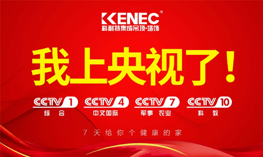 2019年4月,“愛的使者”科耐特吊頂正式登陸央視黃金頻道進行品牌展播,通過美輪美奐的視頻畫面及簡短有力的廣告語,將科耐特“7天給你個健康的家”的品牌訴求傳播到中國乃至世界的每一個角落!