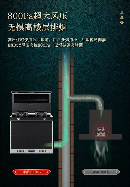 在創(chuàng)新升級方面,康納全新一代變頻消毒集成灶采用直流變頻電機(jī),搭配高速智能芯片,800Pa超大風(fēng)壓,釋放強(qiáng)勁動力,輕松應(yīng)對油煙問題,再也不會出現(xiàn)“做飯高峰期油煙倒灌”現(xiàn)象。