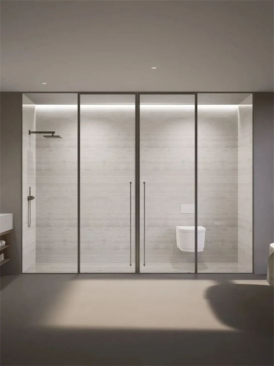 扇形的玻璃門可選用兩邊移開的開門方式,能節省過道空間,也避免磕碰到旁邊的馬桶或柜子。