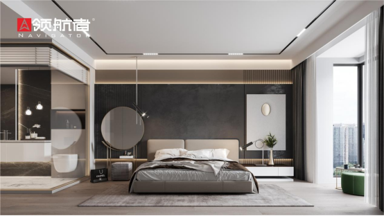 ·臥室的輕奢,是能“卸下疲憊”的溫柔休憩場。領航者家居定制的整體衣柜,柜門選“膚感啞光板”,觸感如云朵般柔和親膚。更藏著貼心定制細節:衣柜內側預留掛長衣的高區、放包包的隔層,每一處設計都提前關照生活需求,讓輕奢不止有視覺上的精致,更延伸到使用時的妥帖舒心。