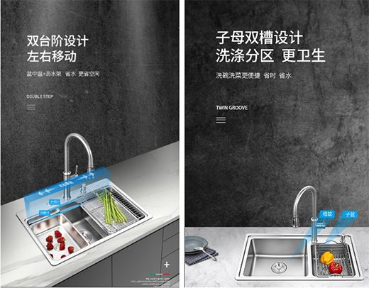 槽體設(shè)計(jì)成臺(tái)階,有利于水槽清潔更加容易。為了讓水槽更加衛(wèi)生和便利,新品設(shè)計(jì)成子母雙槽,實(shí)現(xiàn)洗滌分區(qū),可以同時(shí)實(shí)現(xiàn)洗碗洗菜,即省時(shí)又省水。諾帝瑪從空間的角度出發(fā),設(shè)計(jì)雙臺(tái)階水槽,能夠左右移動(dòng),盆中盆與瀝水架的移動(dòng),更加節(jié)省空間。