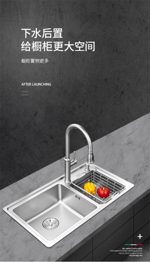 此款新品非常適合小戶型、或者廚房空間有限的家庭。諾帝瑪OH8247雙臺(tái)階單槽特意設(shè)計(jì)下水后置,給廚柜更大空間,充分提高廚房空間的利用率。