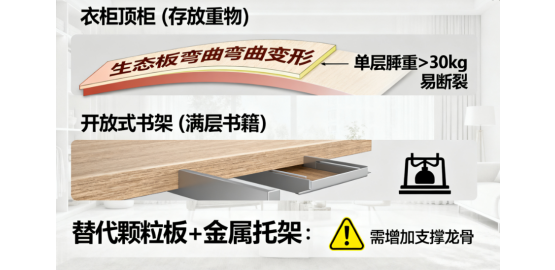 除了高濕度環境,重承載場景也是生態板的“禁區”。生態板的內部結構決定了它的承重能力有限。如果將其用于制作書架、衣柜等需要長期承受較大重量的家具,隨著時間的推移,板材容易出現彎曲、斷裂等問題。特別是在跨度較大的情況下,生態板的承重短板會更加明顯。比如制作大型書架時,若采用生態板,當書籍數量較多時,書架的層板可能會因無法承受重量而發生彎曲,嚴重時甚至會斷裂,存在極大的安全隱患。