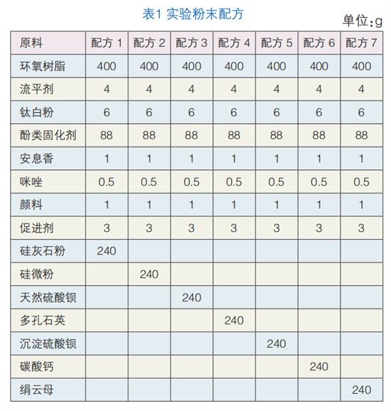 根據(jù)實驗需要,確定環(huán)氧樹脂、固化劑、顏料、助劑的種類與用量,然后通過控制填料的種類進行多配方平行測試,嚴格按照配方(見表1)各成分配比添加原料,經(jīng)過熔融擠出、冷卻、粉碎研磨、分級過篩等步驟制備涂料。