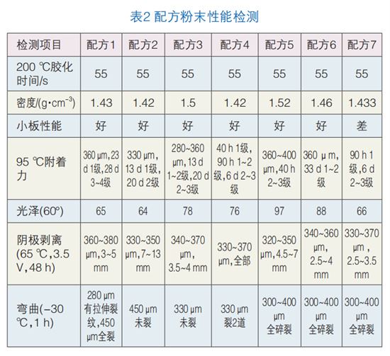 制備出涂料后,對涂料進行全方面的檢測;制作檢測樣板,在放入烤箱預(yù)熱之前噴砂處理。然后用靜電槍把粉末涂料噴涂檢測樣板表面、固化,冷卻至一定溫度后檢測其附著力、陰極剝離、抗彎曲性能等(結(jié)果見表2)。