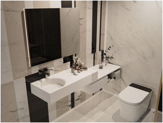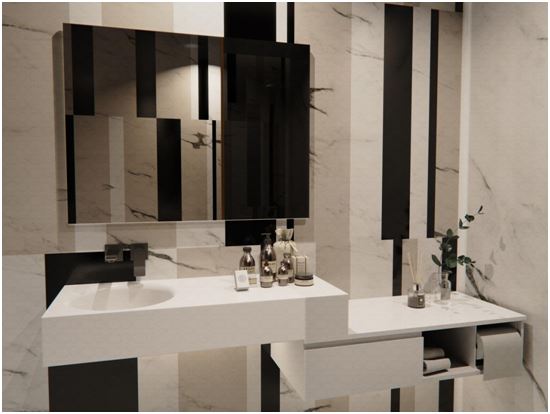 創品高人造石具有獨特的美感和優越的物理性能。它可以打造出光滑無孔無縫的墻面和地面。在墻面上加入米色和黑色的雙色拼接,為整個浴室空間增添生動和活力。這種巧妙的設計不僅增加了視覺趣味性,還激發了空間的活力和熱情。米色象征著溫暖和舒適,給人一種寧靜的感覺,而黑色則顯得穩重和神秘,為空間添加了現代感。兩種顏色的融合形成了鮮明的對比,引發了空間的視覺張力,使得整個浴室煥發出活力。