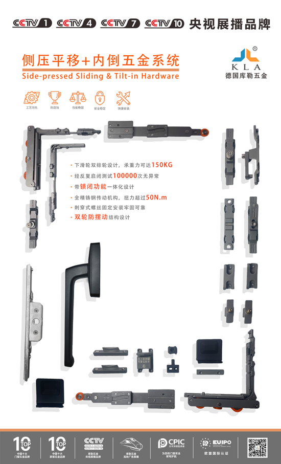庫勒五金攜“中國十大門窗五金品牌”“中國家裝五金品牌”等權威認證,始終深耕門窗系統五金解決方案的研發與創新領域。旗下側壓平移+內倒五金系統作為明星產品,憑借多項硬核技術成為行業標桿:下滑輪采用雙排輪設計,承載量可達150KG,經10萬次反復啟閉測試仍穩定運行;一體化帶鎖閉功能搭配全精鑄鋼傳動機構,鎖閉扭力超50N·m,穩定性遠超行業標準;刺式螺絲固定保障安裝牢固,雙輪防擺動結構徹底解決門窗滑動晃動痛點。依托深厚技術沉淀、嚴苛品質把控及權威榮譽加持,庫勒五金已成為眾多頭部門窗品牌的信賴之選。