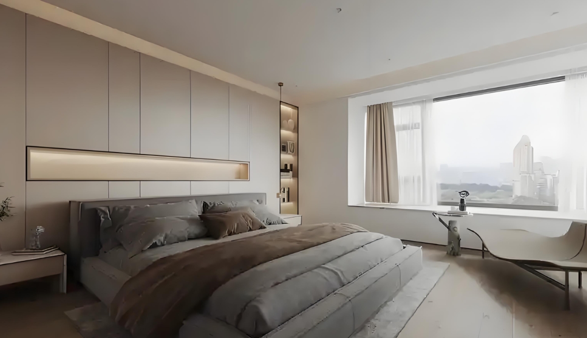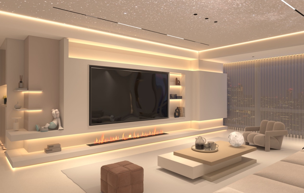 無主燈設計的應用不僅限于大型空間,它的魅力在于其靈活性和適應性,無論戶型大小,都能通過巧妙的設計實現理想的照明效果。例如,在客廳中,可以通過線性射燈安裝在距墻50~60cm處或者反光燈槽洗墻;在電視背景墻上,可以通過筒燈或射燈安裝在距墻25~35cm處,以避免光直射電視屏幕。