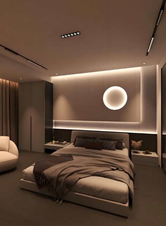 臥室 :臥室是休息和睡眠的空間,應選擇暖色調的燈光,如2700K - 3000K的暖白光,這種色溫的燈光可以營造出溫馨、舒適的氛圍,有助于放松身心,促進睡眠。