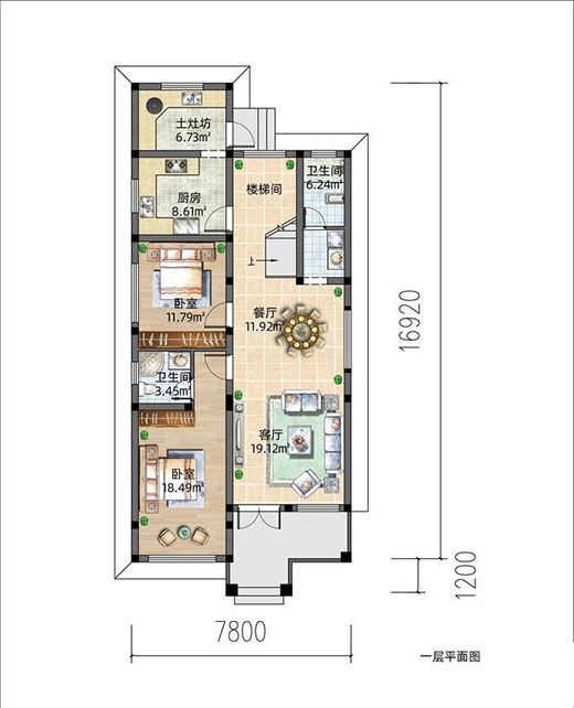一層:進門就是客餐廳,樓梯間右側為干濕分離的公衛,左側為兩臥和廚房,父母房帶獨衛朝南采光風景好,廚房帶有土灶坊也方便燒些大鍋菜~