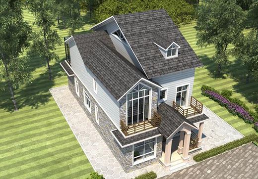 住宅是個很有設計感的美式風格自建房,外觀為冷色調,運用復古文化磚增添外觀的復古氛圍,同時淺灰色墻面磚也增強氛圍感,坡屋頂與老虎窗的搭配更是美式特色。