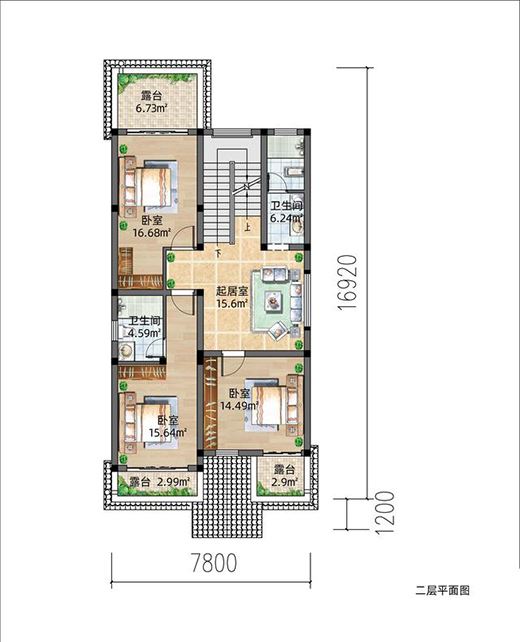 二層:三臥兩衛的布局,朝南的兩臥都帶有露臺,非常舒適,陽光好生活也會更愜意,北面臥室寬敞,帶一個陽光房露臺,可以晾曬衣物,休憩放松。