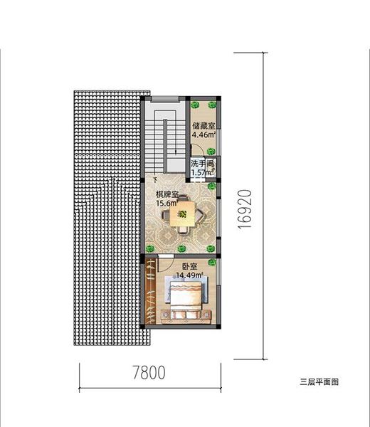 三層:空間較小,可以做些娛樂空間,棋牌室、健身房等,做客房也可以,客人來時也有休息場所。