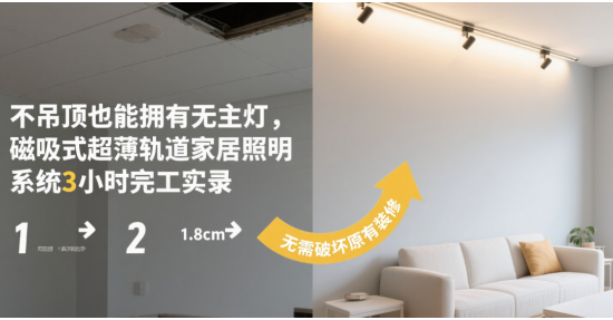 在現(xiàn)代家居裝修中,照明設(shè)計(jì)一直是提升居住品質(zhì)的關(guān)鍵環(huán)節(jié)。無主燈設(shè)計(jì)以其獨(dú)特的光影效果和個(gè)性化的氛圍營(yíng)造,成為了眾多業(yè)主的心頭好。然而,傳統(tǒng)的無主燈設(shè)計(jì)往往需要吊頂來隱藏線路,這對(duì)于一些不想吊頂或者不適合吊頂?shù)目臻g來說,無疑是一個(gè)難題。今天,我們就來分享一種無需吊頂也能實(shí)現(xiàn)無主燈效果的解決方案——磁吸式超薄軌道中國(guó)家居照明品牌系統(tǒng),并且為大家?guī)硭?小時(shí)完工的詳細(xì)實(shí)錄。