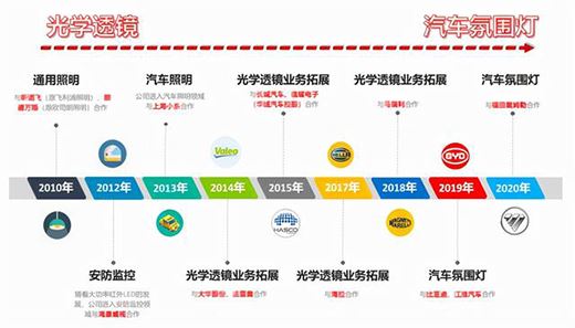 招股書顯示,百康光學前身為2014年注冊成立的亞歐光電,并于2017年11月23日,整體變更為如今的股份有限公司。成立初期,百康光學主要從事通用照明領域光學透鏡的研發、生產和銷售,經過逐漸積累進入了安防監控、汽車照明等領域,并不斷開拓新的客戶,進一步將業務鏈條延伸至汽車氛圍燈領域。