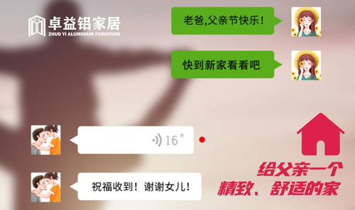 卓益鋁家居提供鋁家居整體定制方案、一站式購齊配套和整合供應體系,全方位打造符合現(xiàn)代生活環(huán)保健康需求的產(chǎn)品,締造低碳健康生活,開啟節(jié)能美好新時代。趁著父親節(jié),為父親定制一套卓益鋁家居,讓家真正成為避風的港灣、溫馨的搖籃、健康安全的人間天堂。