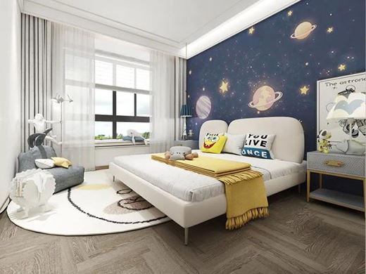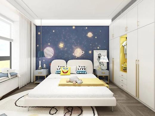 兒童房床頭墻面選用卡通宇宙圖案,可愛又富有童趣,定制的到頂衣柜開放格使用了檸檬黃色,色彩靚麗,有活力。