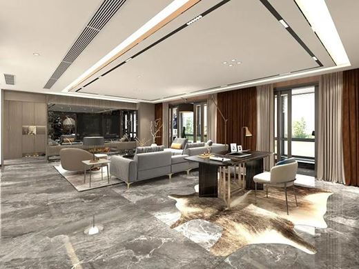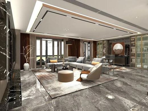 客廳大面積使用大理石材質,時尚又大氣,搭配落地大窗很有高級感,吊頂的設計簡約大方,充足的光源使房間明快敞亮。