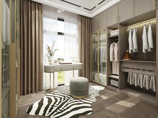 衣帽間環繞型衣柜提供充足的儲物空間,封閉區、懸掛區、儲物格分區合理功能齊全,靠窗設置梳妝臺,精美實用。