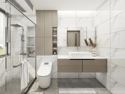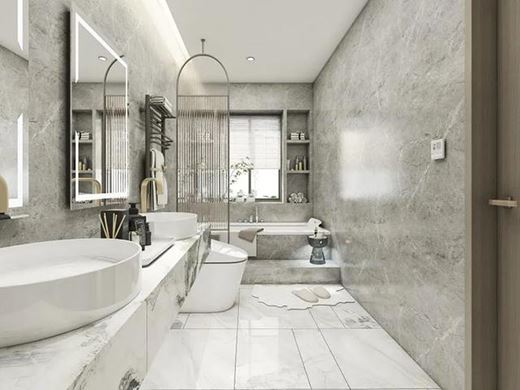 主臥衛生間空間充足,靠窗設計浴缸,在這里泡澡愜意舒適,盡享品質生活,利用墻面嵌入開放格,美觀實用。