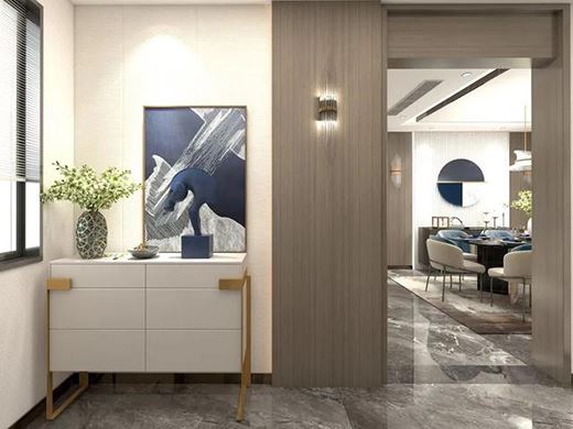 入戶放置了簡約時尚的矮柜,可以作為鞋柜使用,上邊擺放了精美的雕塑和綠植,讓人進門就看到房間的精致一角。