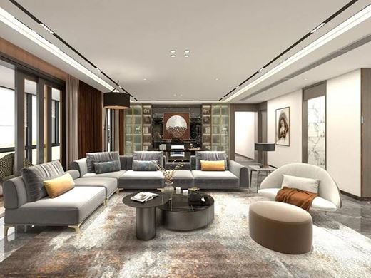 地面大面積鋪設地毯,柔和了大理石瓷磚帶來的冷硬感,整體更加溫馨舒適,灰色的拐角沙發優雅沉穩,房間處處給人精致舒適感。
