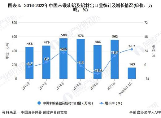 據中國海關總署統計數據顯示,2021年全年中國未鍛軋鋁及鋁材累計出口量達到了5619130噸(561.91萬噸),累計增長15.7%。截至2022年3月中國未鍛軋鋁及鋁材出口量為594361噸(59.44萬噸),同比增長34.1%。累計方面,2022年1-3月中國未鍛軋鋁及鋁材累計出口量達到1628336噸(162.83萬噸),累計增長26.7%。