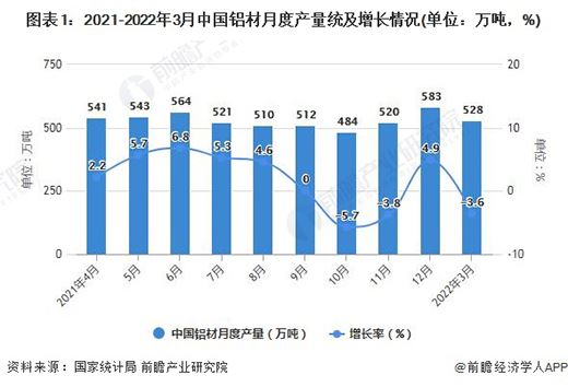 據國家統計局數據顯示,2021年全年中國鋁材累計產量達到了6105.2萬噸,累計增長7.4%。截至2022年3月中國鋁材產量為528萬噸,同比下降3.6%。累計方面,2022年1-3月中國鋁材累計產量達到1393.7萬噸,累計下降0.5%。